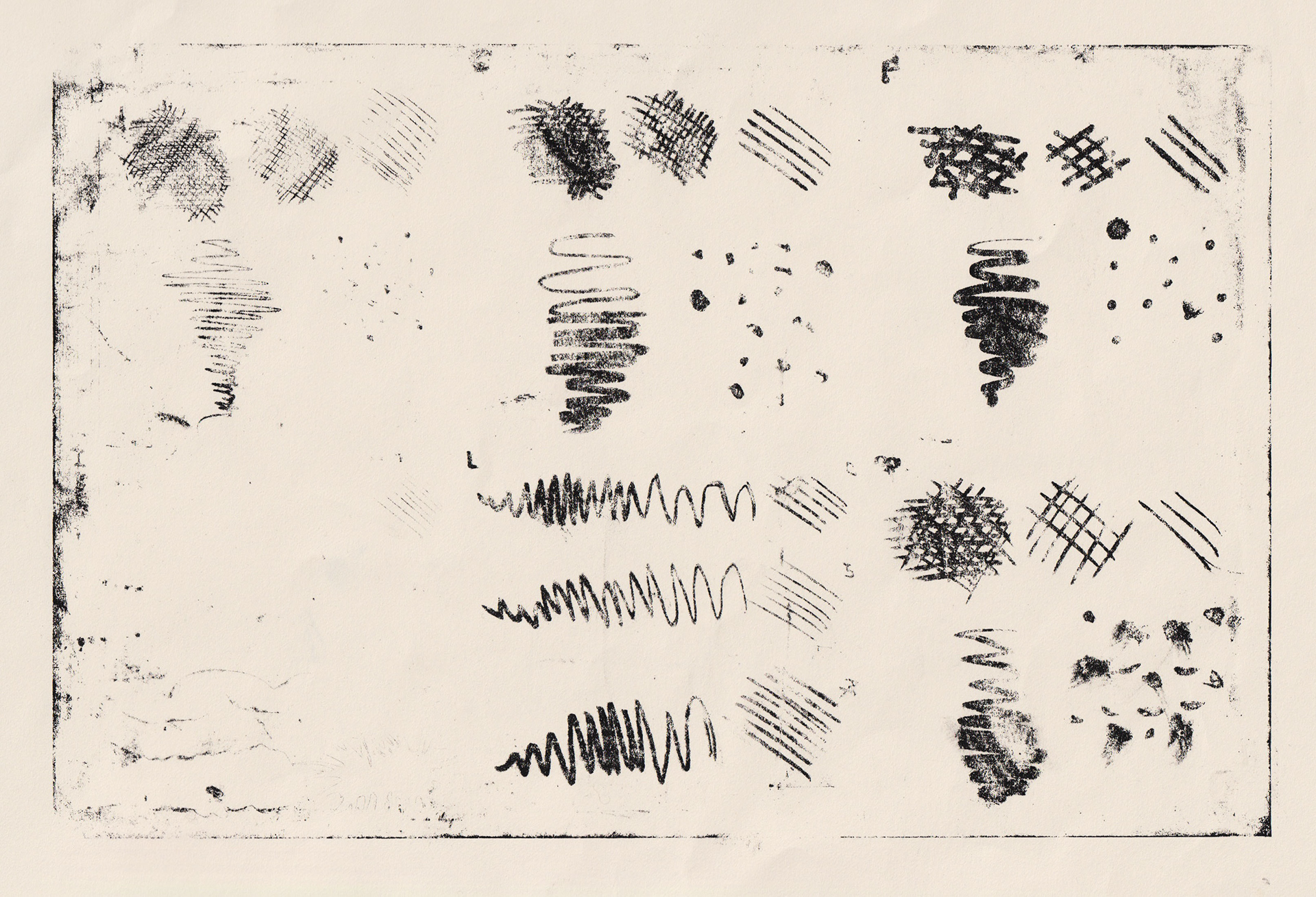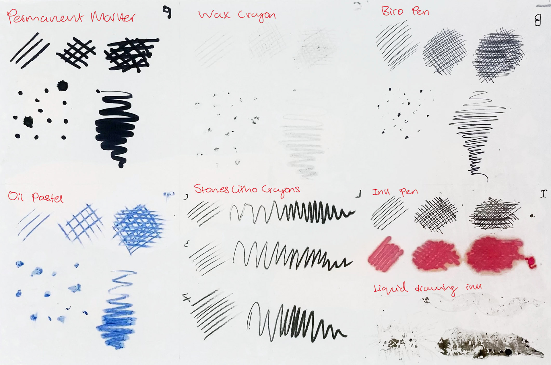 I brought a plate from Handprinted, but these are also available at Intaglio Printmaker. With one 33 x 50cm sheet I was able to make four test plates about A5 size. On the first test plate I used permanent marker, wax crayon, biro pen, oil pastel, stones lithography crayons, oil-based ink and a liquid ink pen. When drawing on the plate and printing, I followed the instructions on the Handprinted website. I printed the polyester plates using a spoon.