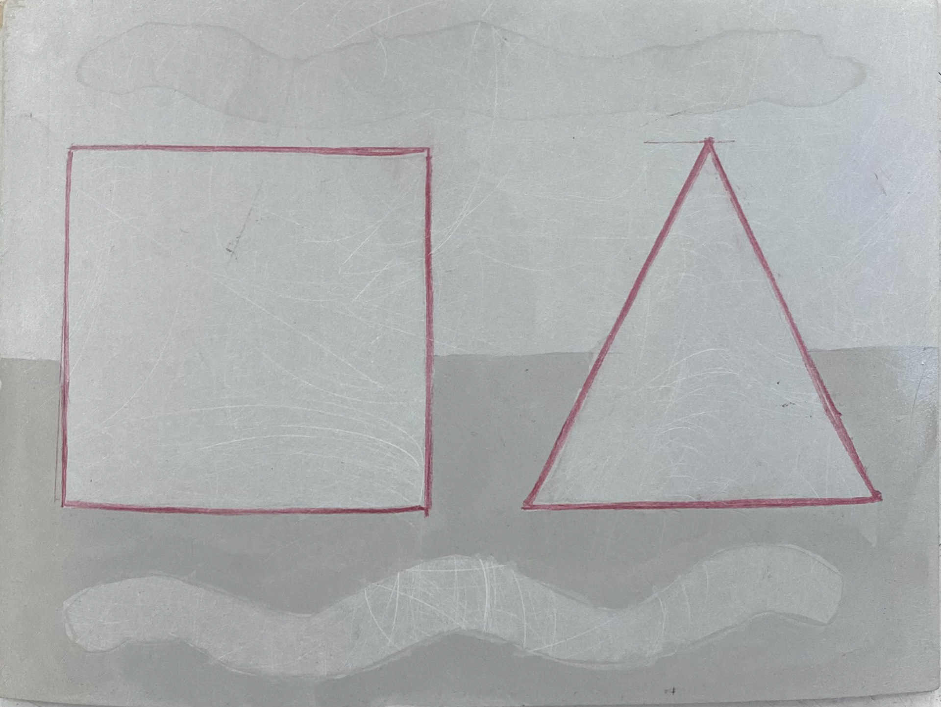 Also following Scarlett’s book, I had a second test plate where I tried a Lo Shu wash. The lino was prepped the same as the previous plate. The only difference was that I had this plate dry inside while the other dried outside. This meant the Lo Shu plate had a smooth background that hadn’t picked up any texture from crackled gum. For the wash I used a ratio of 2 drops gum Arabic to 40ml of warm water as this is what worked best when experimenting with Lo Shu washes on stone. This was applied to the lino and left to air dry. When dry, I painted gum on half the plate around the lo Shu shapes. This was to see the difference between an inked and plain background against the washes.