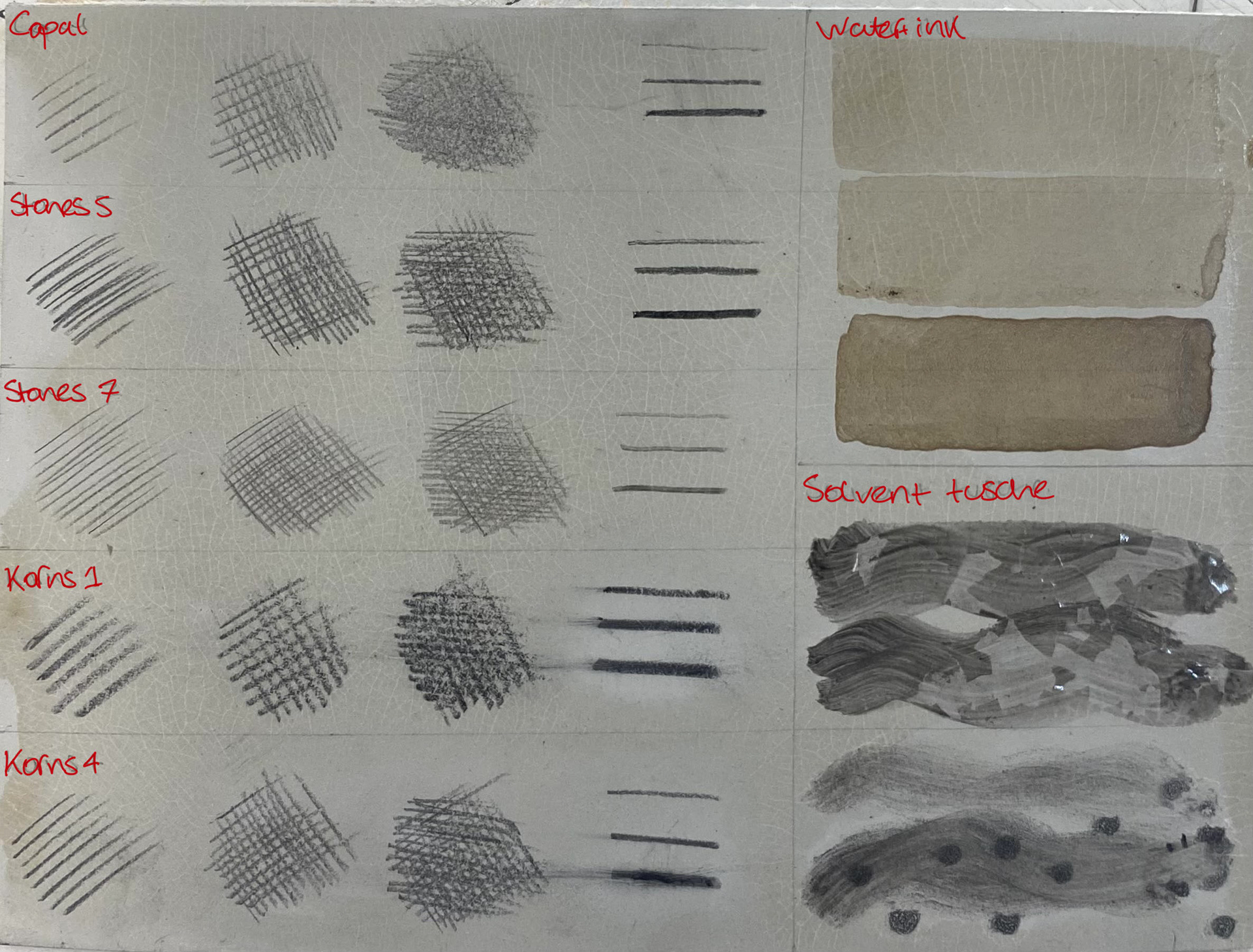 To begin, we sanded down an A5 piece of lino that would act as our test plate. This is to get rid of the water-resistant surface. The plate is then able to be drawn on immediately with the usual lithography materials. On my plate I tested a range of drawing materials to see how each would print. This is then covered with gum and left to rest at least for 24 hours.